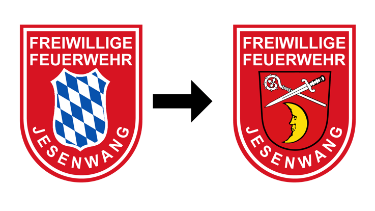 „In Rot ein gesichteter goldener Halbmond, darüber schräg gekreuzt ein silberner Bischofsstab und ein gestürztes silbernes Schwert“. So wird das Wappen der Gemeinde Jesenwang beschrieben, welches in Zukunft auch Teil des Wappens, des Logos und des Ärmelabzeichens der Feuerwehr Jesenwang sein wird und das bisherige weißblaue Staatswappen ersetzen wird.