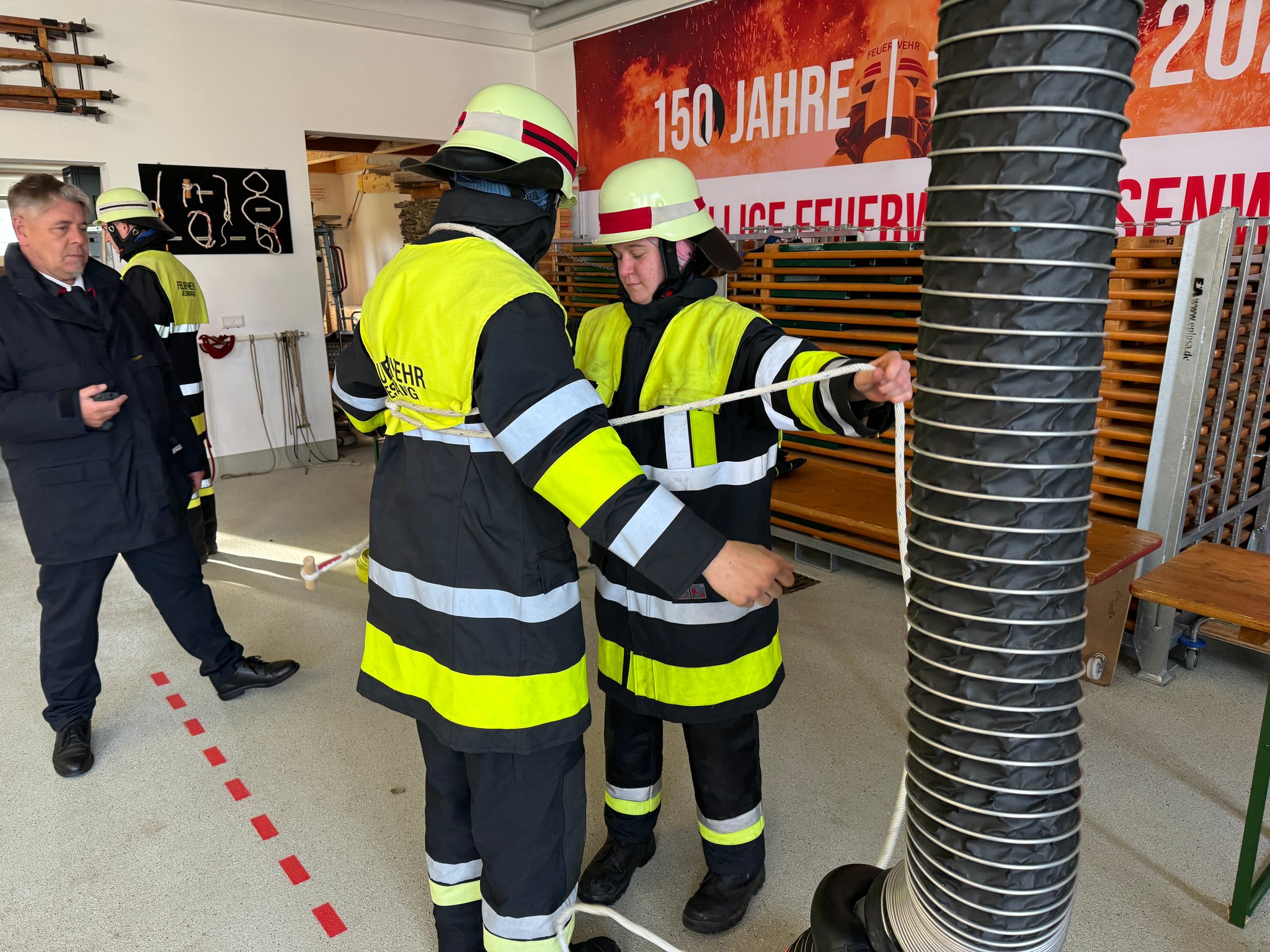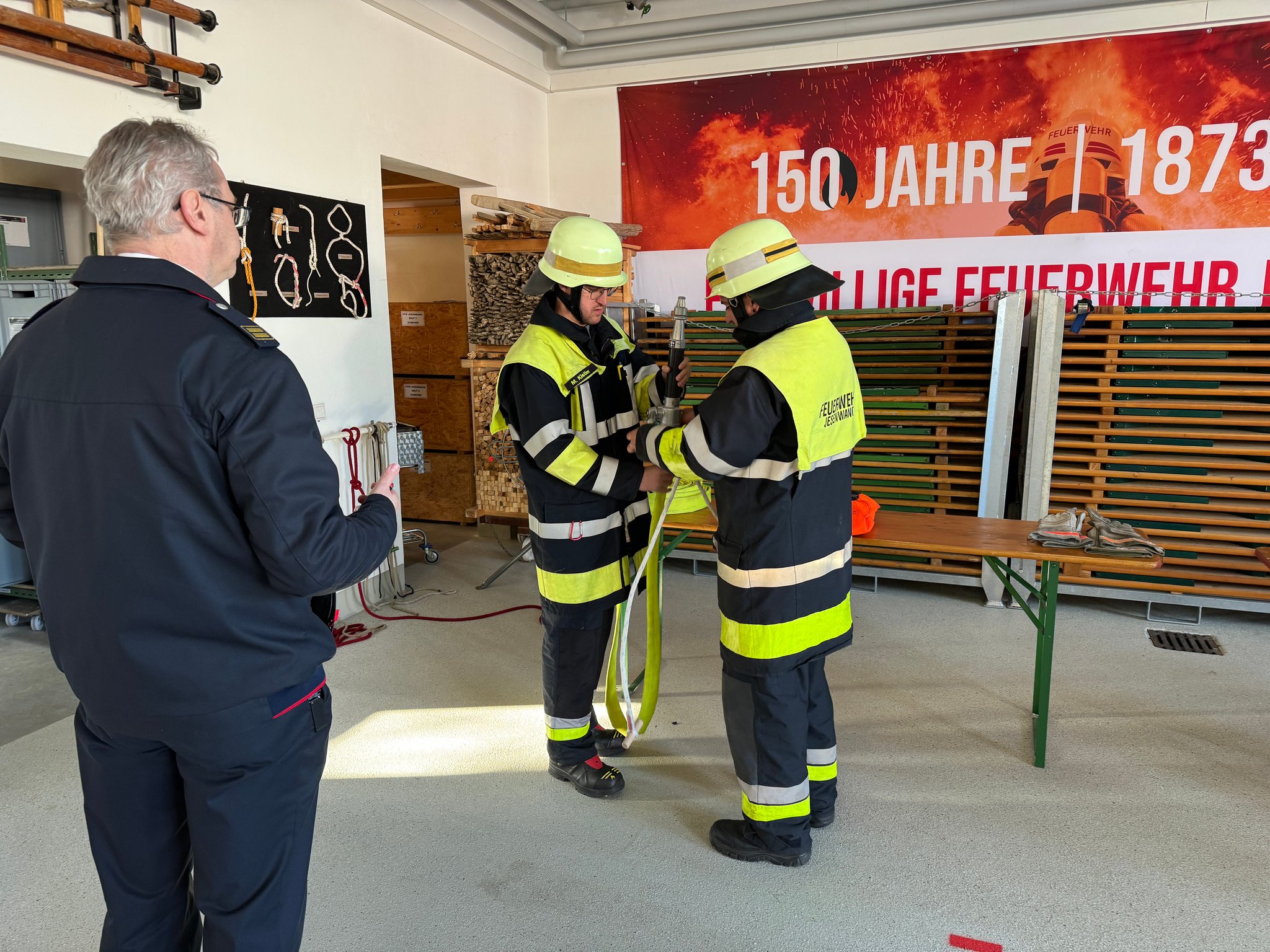 Die Abnahme ist dabei in mehrere Einzelaufgaben geteilt. Zunächst Knoten und Stiche sowie Zusatzaufgaben geprüft, folgend ein Löschaufbau und eine Saugleitung gekuppelt - und dies alles auf Zeit!